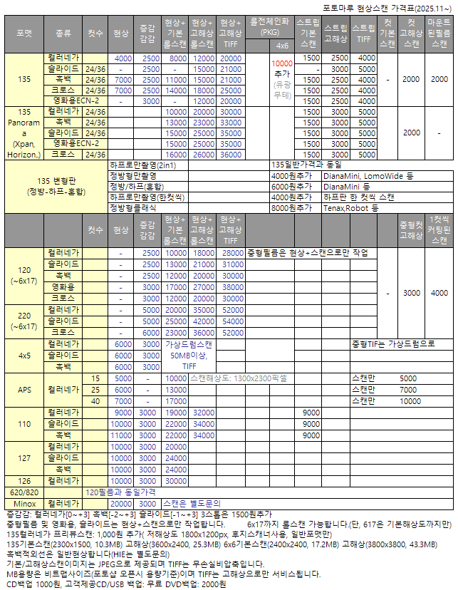 135(35mm)Çʸ§ÀÇ ÀÏ¹Ý Æ÷¸ËÀÌ ¾Æ´Ñ ÇÏÇÁÆÇÀ̳ª Á¤¹æÇü, ȤÀº ÇÏÇÁ¿Í Á¤¹æÇüÀ» ¼¯¾î¼ ÃÔ¿µÇÏ´Â Ä«¸Þ¶óµéÀÌ ÀÖ½À´Ï´Ù. ÇÏÇÁ·Î¸¸ ÃÔ¿µµÈ °æ¿ì º°µµÀÇ ¿äûÀÌ ¾ø´Ù¸é ÇÑ ÄÆ¿¡ µÎ ÇÁ·¹ÀÓ(2 in 1)À¸·Î ½ºÄµÇÏ¿©µå¸®¸ç ÀÌ ¶§´Â ÀÏ¹Ý Æ÷¸ËÀÇ Á¤»ó°¡°Ý°ú µ¿ÀÏÇÕ´Ï´Ù. ÇÑ ÄÆ¾¿ º°µµ·Î ½ºÄµÀ» ¿äûÇϼŵµ ÀÛ¾÷ÀÌ °¡´ÉÇÕ´Ï´Ù. À§ÀÇ °¡°ÝÇ¥ Áß ¾Æ·¡ÀÇ 135 º¯ÇüÆÇÇü ó¸® ºÎºÐÀ» Âü°íÇÏ½Ã¸é µË´Ï´Ù.